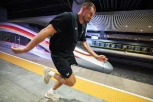 在约基奇所乘列车进站时,约基奇尝试与高铁“赛跑”并“惜败对手”。